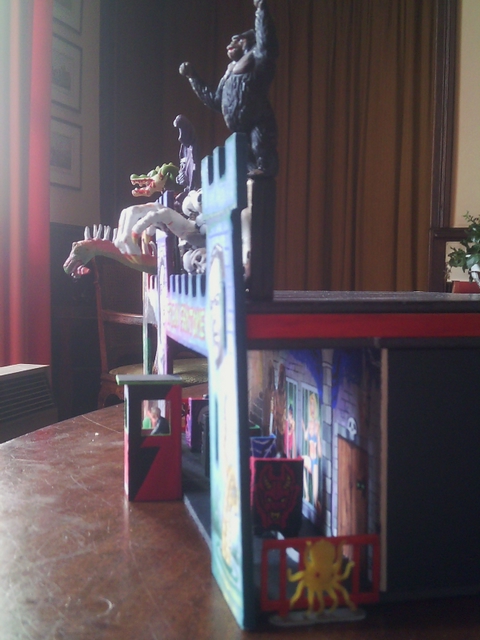 La façade provient d’un petit château en bois brut à peindre (hauteur 13, 5cm) acheté 4 euros dans un magasins de loisirs créatifs. Je l’ai découpé à la scie pour lui donner la dimension de façade voulue. Pour peindre cette façade, je me suis inspiré de diverses photos de vieux films d’horreur (Boris Karloff dans Frankenstein…) ou affiches (un film genre King Kong) ainsi que de pulps magazines américains des sixties (posture de la fille attachée) et j’ai inventé le reste. La technique : gouache sur bois, quatre couches de verni en bombe pour que ça tienne dans le temps.